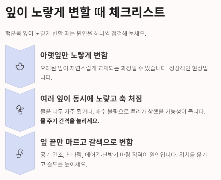행운목 잎이 노랗게 변할 때는 원인을 하나씩 점검해 보세요.